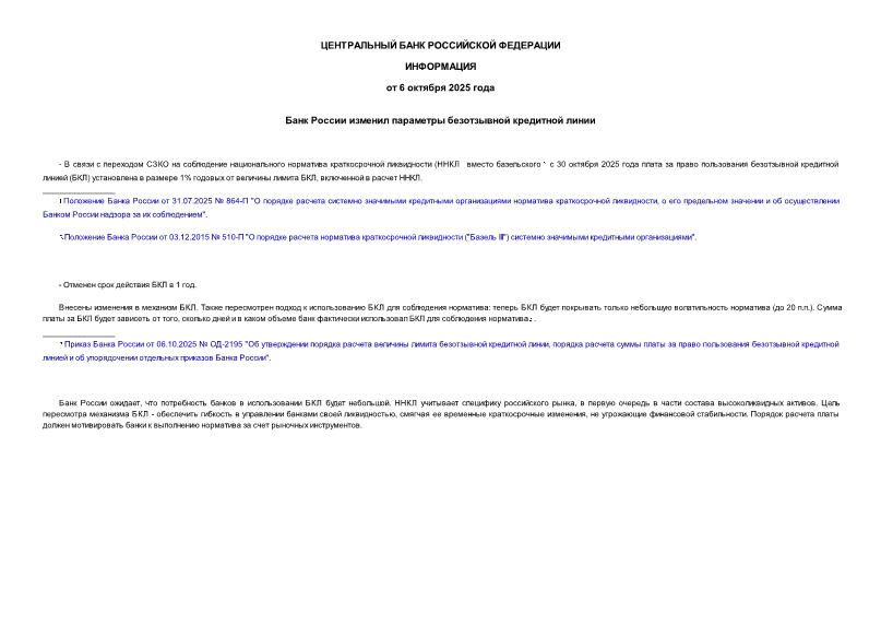 Статус: Информационный документ Текст документа: присутствует в коммерческой версии NormaCS Утвержден: Банк России; Центральный банк Российской Федерации, 06.10.2025 Обозначение: Информация Наименование: Банк России изменил параметры безотзывной кредитной линии Дополнительные сведения: доступны через сетевой клиент NormaCS. После установки нажмите на иконку рядом с названием документа для его открытия в NormaCS