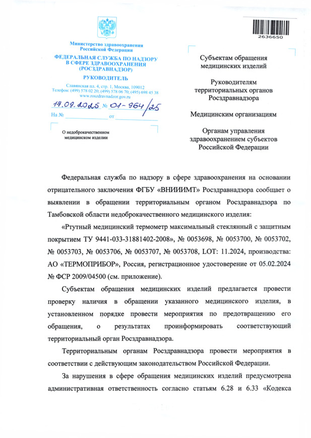 Письмо 01И-964/25 О недоброкачественном медицинском изделии