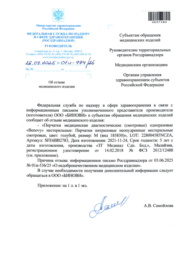 Статус: Информационный документ Утвержден: Росздравнадзор; Федеральная служба по надзору в сфере здравоохранения и социального развития, 26.09.2025 Обозначение: Письмо 01И-994/25 Наименование: Об отзыве медицинского изделия Дополнительные сведения: доступны через сетевой клиент NormaCS. После установки нажмите на иконку рядом с названием документа для его открытия в NormaCS