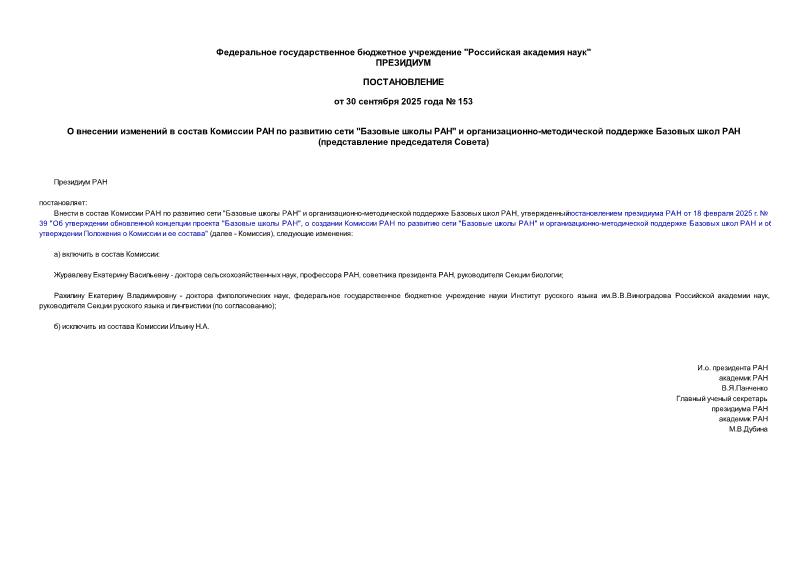 Постановление 153 О внесении изменений в состав Комиссии РАН по развитию сети "Базовые школы РАН" и организационно-методической поддержке Базовых школ РАН (представление председателя Совета)