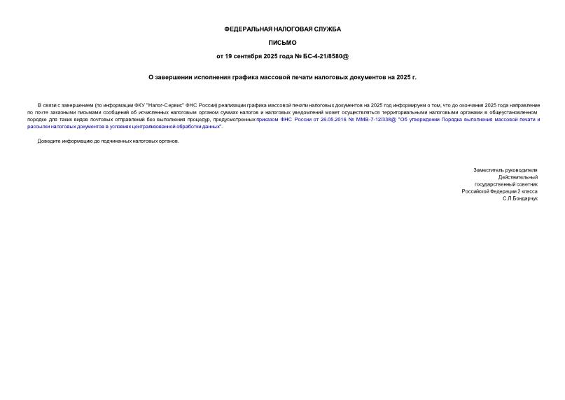 Письмо БС-4-21/8580@ О завершении исполнения графика массовой печати налоговых документов на 2025 г.