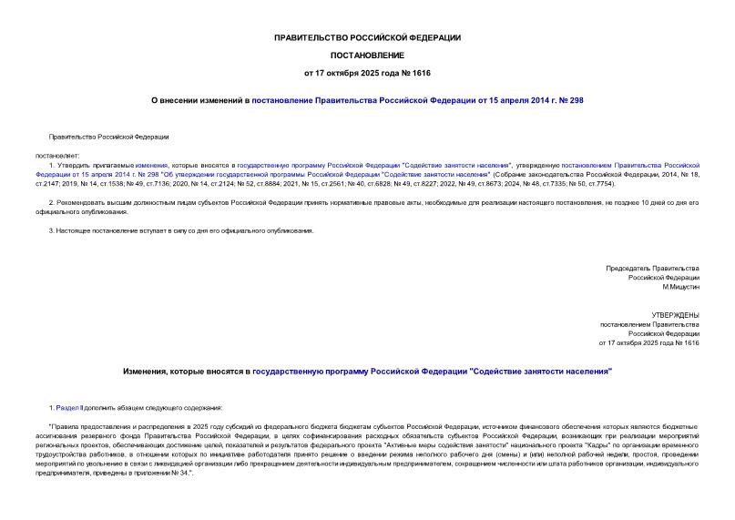 Статус: Действует Текст документа: присутствует в коммерческой версии NormaCS Утвержден: Правительство РФ; Правительство Российской Федерации, 17.10.2025 Обозначение: Постановление 1616 Наименование: О внесении изменений в постановление Правительства Российской Федерации от 15 апреля 2014 г. № 298 Дополнительные сведения: доступны через сетевой клиент NormaCS. После установки нажмите на иконку рядом с названием документа для его открытия в NormaCS