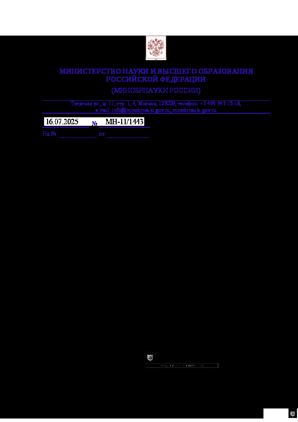 Статус: Действует Текст документа: присутствует в коммерческой версии NormaCS Утвержден: Минобрнауки России; Министерство науки и высшего образования Российской Федерации, 16.07.2025 Обозначение: Письмо МН-11/1443 Наименование: О направлении материалов Дополнительные сведения: доступны через сетевой клиент NormaCS. После установки нажмите на иконку рядом с названием документа для его открытия в NormaCS