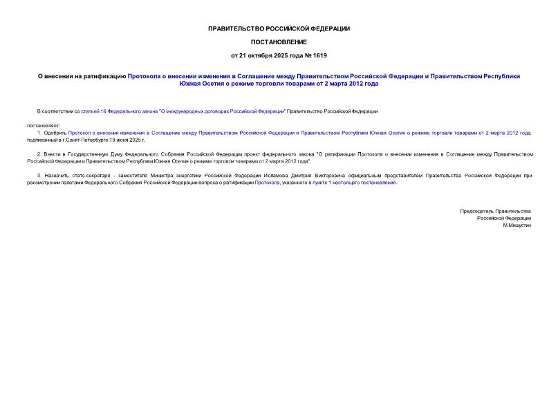Постановление 1619 О внесении на ратификацию Протокола о внесении изменения в Соглашение между Правительством Российской Федерации и Правительством Республики Южная Осетия о режиме торговли товарами от 2 марта 2012 года