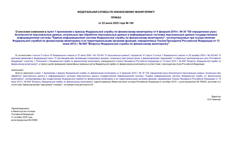 Приказ 149 О внесении изменения в пункт 1 приложения к приказу Федеральной службы по финансовому мониторингу от 6 февраля 2019 г. № 30 "Об определении угроз безопасности персональных данных, актуальных при обработке персональных данных в информационных системах персональных данных государственной информационной системы "Единая информационная система Федеральной службы по финансовому мониторингу", эксплуатируемых при осуществлении Федеральной службой по финансовому мониторингу и ее территориальными органами функций, определенных Указом Президента Российской Федерации от 13 июня 2012 г. № 808 "Вопросы Федеральной службы по финансовому мониторингу"
