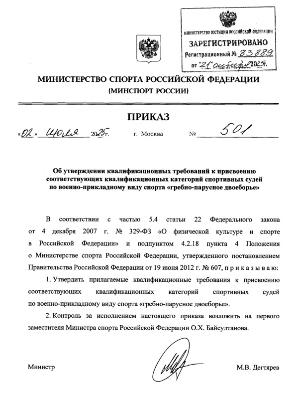 Приказ 501 Об утверждении квалификационных требований к присвоению соответствующих квалификационных категорий спортивных судей по военно-прикладному виду спорта "гребно-парусное двоеборье"